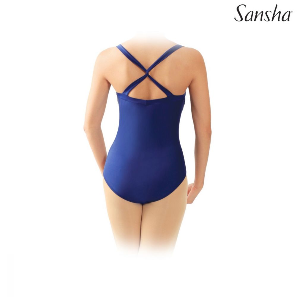 V-neck style front, camisole-style straps cross in back for a unique twist on this classic black leotard. (Midnight blue pictured, only black available).