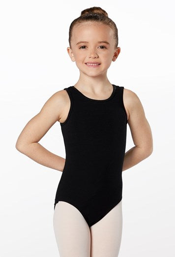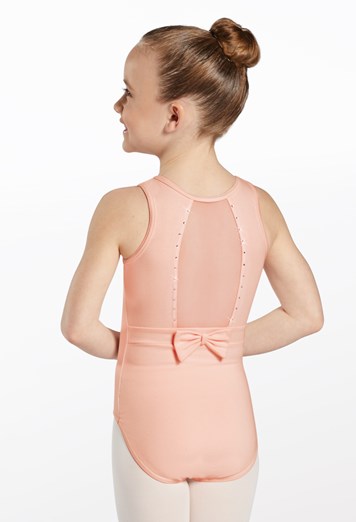 This soft, 4-way stretch cotton leotard from Weissman Designs features a tank-style neckline, an unlined power mesh inset with rhinestones and bow in back, and modest scoop neck. Front is fully lined.