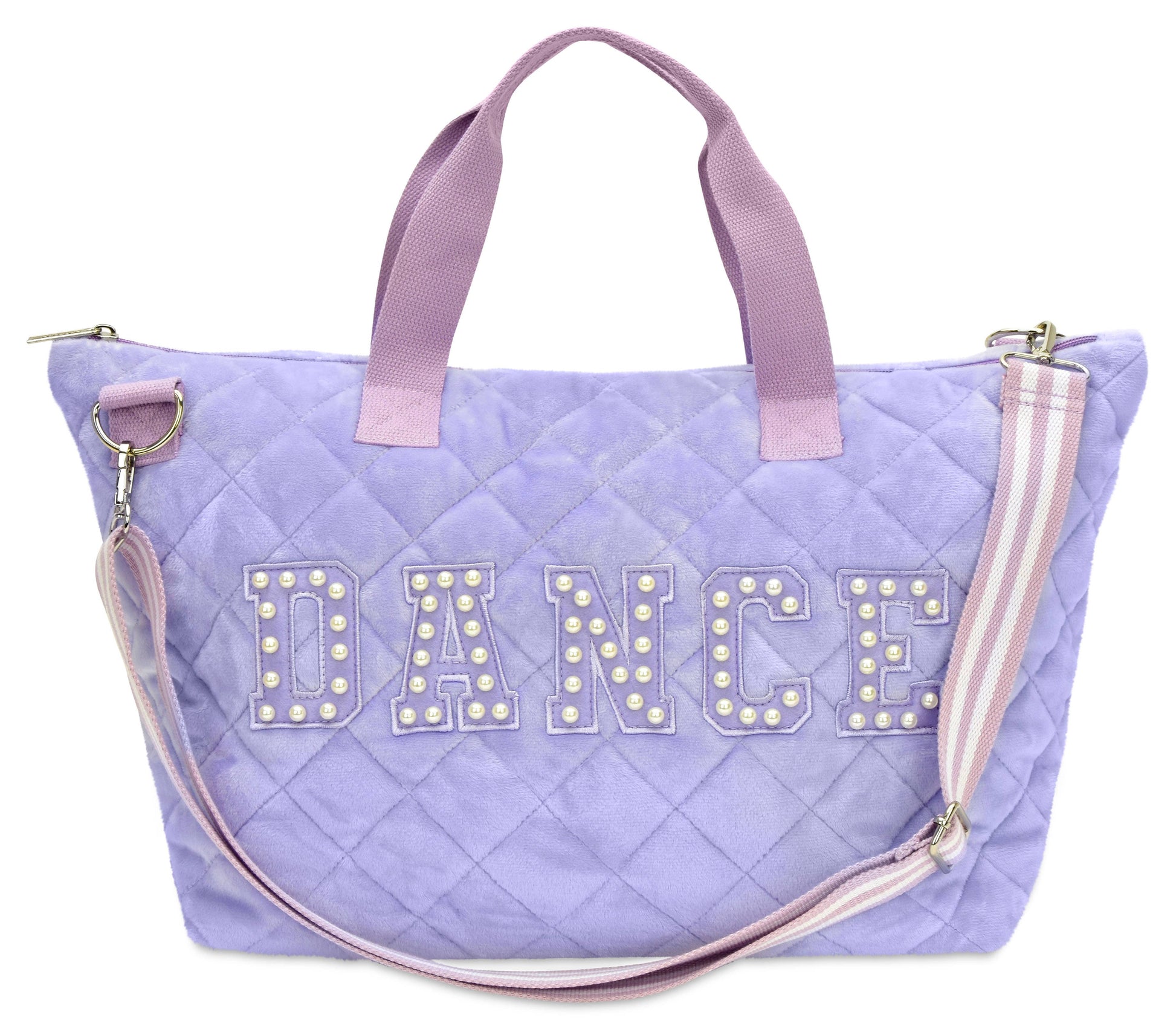DANCE quilted overnight bag – holiday Velveteen material Pearl patches Zipper closures Inside zipper pocket Adjustable, removable shoulder strap Lined 20 1/2" w x 11 1/4" h x 8" d.