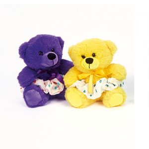 Cute and cuddly bears each wearing assorted tutus that double as scrunchies. Stuffed with hypoallergenic fiber fill. Measure approximately 6" tall.