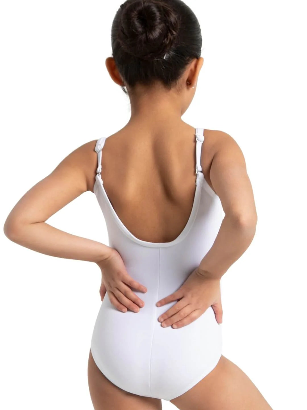Capezio's Team Basics Camisole Leotard with Adjustable Straps in white or nude. Made of a nylon/spandex combination, this leotard is soft and flexible. Adjustable straps ensure a custom fit while the double-stitched seams guarantee long-lasting wear.