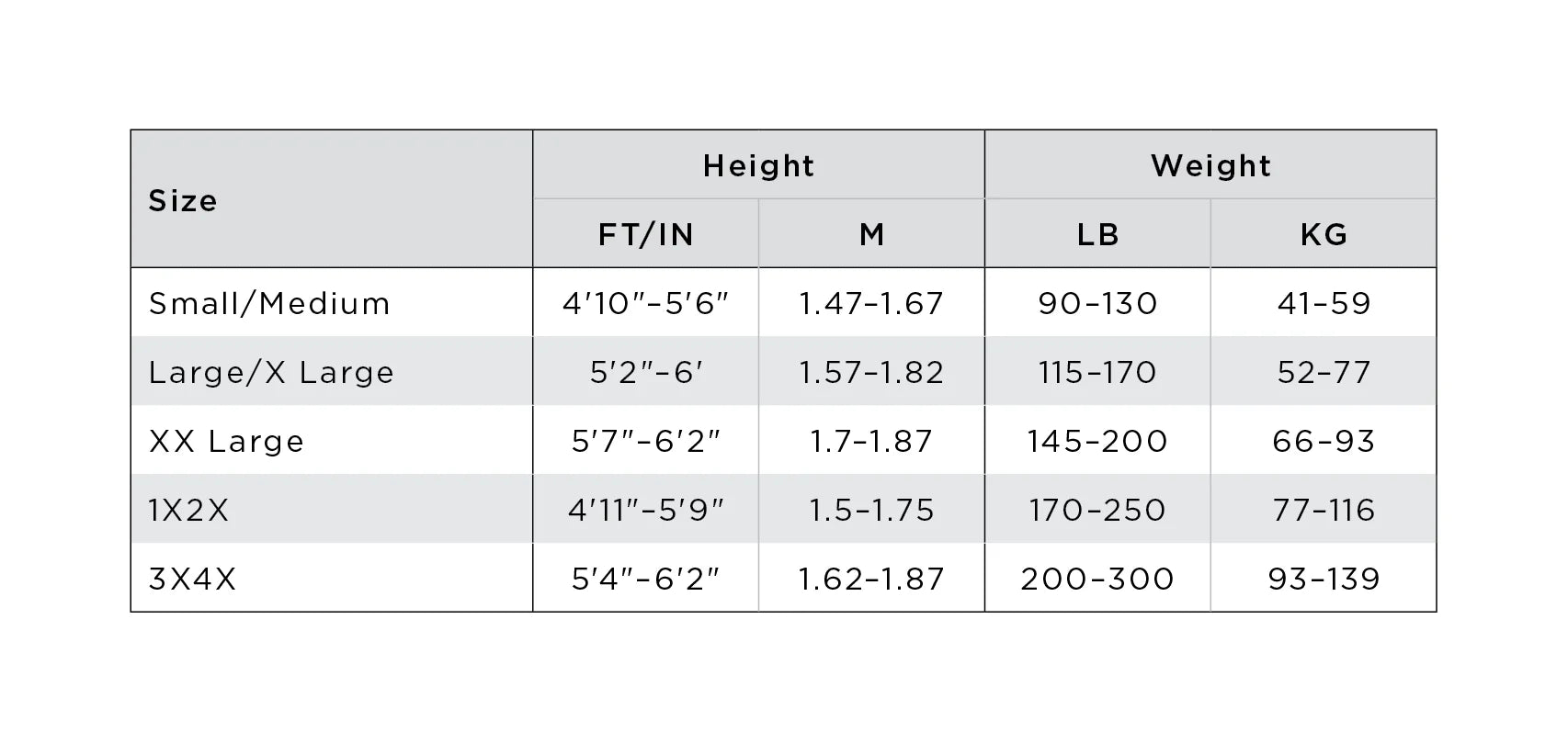 - Adult XX Large: 5'7"-6'2", 145-200 lbs.
