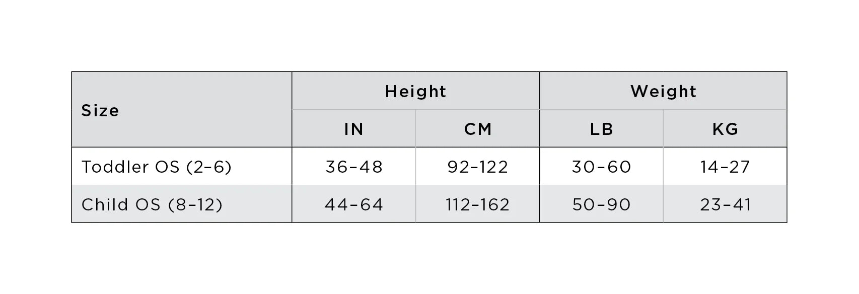 - Toddler One size (OS): 2-6 - 36-48 inches, 30-60 lbs.