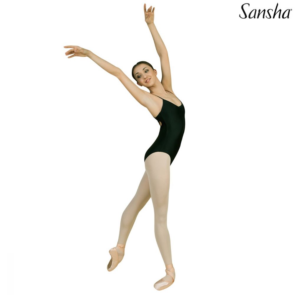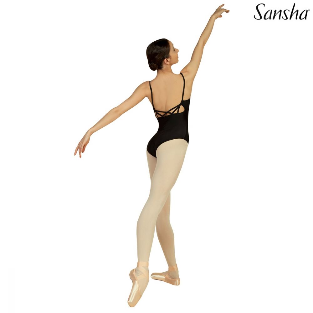 Classic black camisole leotard with decorative strap design at mid-back.