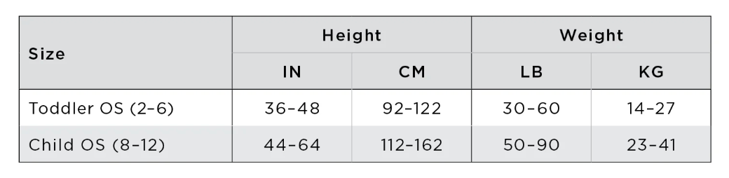 - Toddler OS (2-6) fits 36-48" tall, 30-60 lbs.