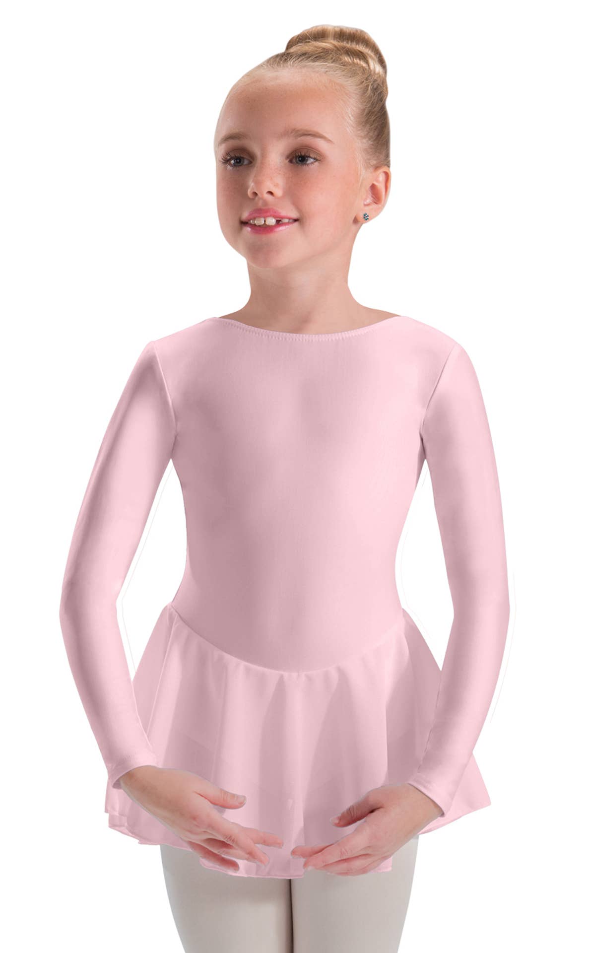 Perfect for your little dancer with a crew-height neckline, scoop back and good skirt length, this long-sleeve leotard provides ideal modesty. Comfortable arm and leg openings stay in place when performing. The attached, color-matched crepe skirt is made from a full circle of fabric that will inspire your darling ballerina to spin.