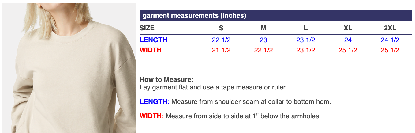 Relaxed fit: loose fit on body, chest, & arms (see images for sizing chart)